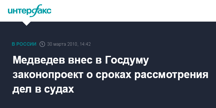 Горки. 30 марта. INTERFAX.RU - Президент РФ Дмитрий Медведев сообщил, что внес в Госдуму законопроект, касающийся сроков рассмотрения дел в российских судах.