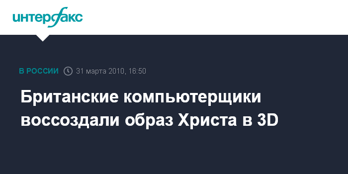 Москва. 31 марта. INTERFAX.RU – Специалисты по компьютерной графике из Великобритании объявили, что смогли воссоздать облик Иисуса Христа по Туринской плащанице, используя технологию 3D.