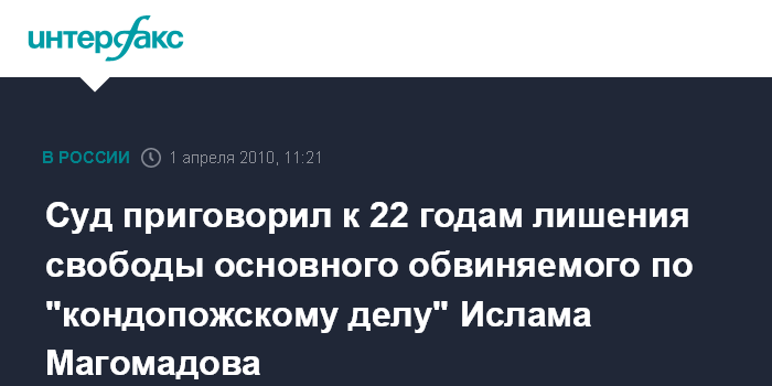 Москва. 1 апреля. INTERFAX.RU – Верховный суд Карелии приговорил основного обвиняемого по "кондопожскому делу" Ислама Магомадова к 22 годам лишения свободы с отбыванием первых 5 лет в тюрьме, передал корреспондент "Интерфакса".
