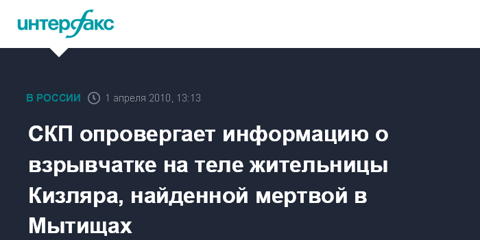 Она опровергла сообщения ряда СМИ о том, что на теле погибшей могла находиться взрывчатка. "Ни на теле, ни возле него никаких взрывчатых веществ либо взрывных устройств не обнаружено", - сказала представитель следственного управления.