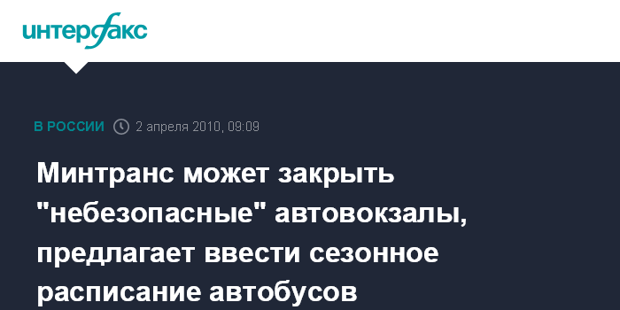 Москва. 2 апреля. INTERFAX.RU - Министерство транспорта РФ намерено провести проверки автовокзалов в 2010 году на соответствие закону "О транспортной безопасности" и может закрыть терминалы, не соответствующие требованиям закона, сообщила пресс-служба министерства.