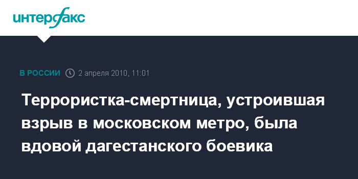Москва. 2 апреля. INTERFAX.RU - Установлена личность как минимум одной террористки-смертницы, устроившей теракт в московском метро, сообщил агентству "Интерфакс-Юг" информированный источник в правоохранительных органах Дагестана.