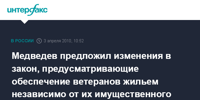 Москва. 3 апреля. INTERFAX.RU – Президент России Дмитрий Медведев внес в Госдуму законопроект о внесении изменений в закон "О ветеранах", которые касаются порядка обеспечения ветеранов жильем.