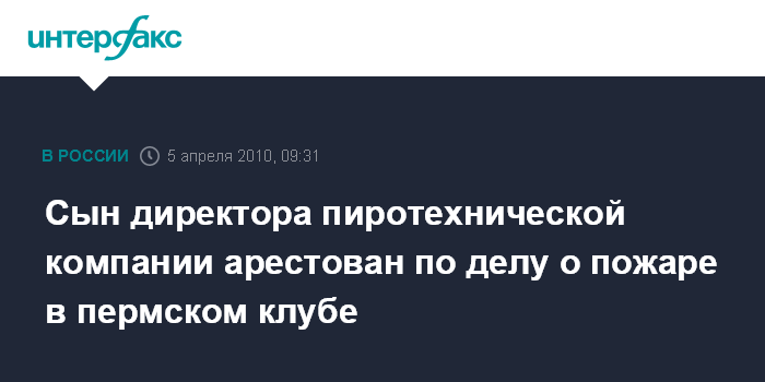 Москва. 5 апреля. INTERFAX.RU - Ленинский районный суд избрал меру пресечения в виде заключения под стражу для сына директора ООО "Пиротехническая компания "Пироцвет" Игоря Дербенева по делу о пожаре в пермском клубе "Хромая лошадь". "Суд в пятницу арестовал И.Дербенева сроком на два месяца, сейчас он находится в СИЗО", - сообщил агентству "Интерфакс-Поволжье" его адвокат Денис Федотов в понедельник.