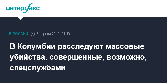 Лондон. 6 апреля. ИНТЕРФАКС - Генеральная прокуратура Колумбии начинает расследование более 2 тыс. случаев убийств, совершенных, предположительно, сотрудниками спецслужб страны за последние 25 лет, сообщает во вторник британская телерадиовещательная корпорация Би-би-си.