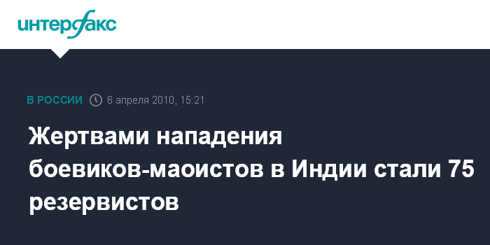 Дели. 6 апреля. INTERFAX.RU - Не менее 75 индийских полицейских резервистов погибли, попав во вторник в засаду в индийском штате Чхаттисгарх, сообщает индийская газета "Хиндустан таймс".