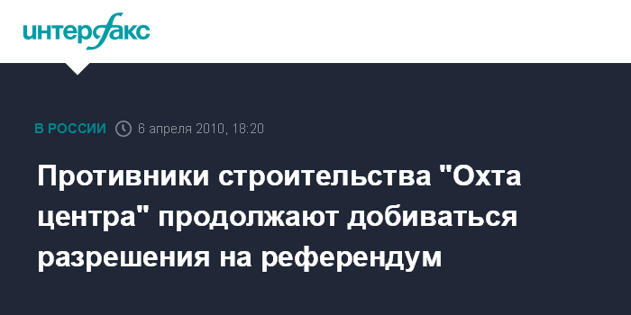 Санкт-Петербург. 6 апреля. INTERFAX.RU - Противники строительства "Охта центра" в Петербурге подали еще одно заявление в суд по поводу отказа в проведении референдума.