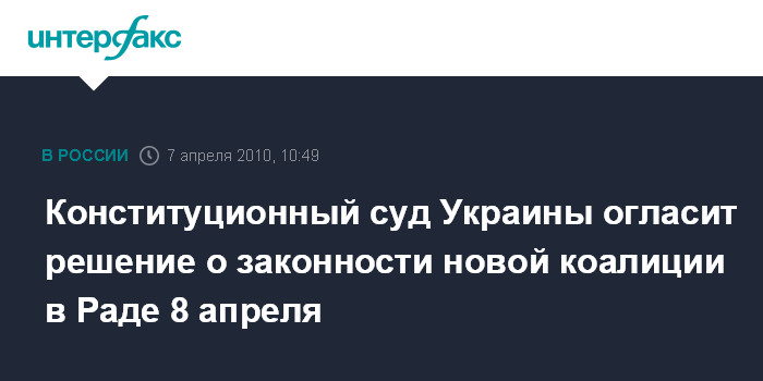Москва. 7 апреля. INTERFAX.RU - Конституционный суд Украины в четверг, 8 апреля, обнародует решение по официальному толкованию положений Конституции и регламента Верховной Рады, касающихся порядка формирования парламентской коалиции при участии отдельных народных депутатов. Об этом агентству "Интерфакс-Украина" сообщили в пресс-службе КС в среду.