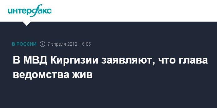Москва. 7 апреля. INTERFAX.RU - Сведения о гибели главы МВД Киргизии Молдомусы Конгатиева не соответствуют действительности, заявил исполняющий обязанности начальника пресс-службы министерства Рахматилло Ахмедов. "Эта информация (о смерти министра - ИФ) вымышленная, ложная", - сказал Р.Ахмедов в среду в интервью радиостанции "Эхо Москвы".