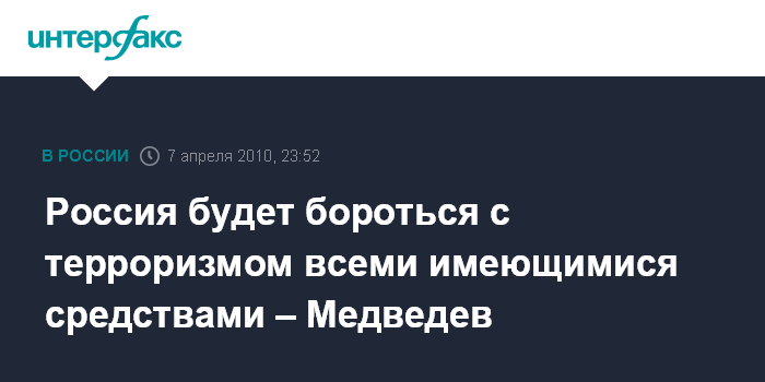 "Мы продолжим борьбу с терроризмом всеми имеющимися у нашего государства средствами", - сказал Д.Медведев в среду на встрече с чешским коллегой Вацлавом Клаусом.