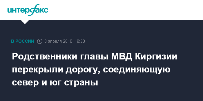Бишкек. 8 апреля. INTERFAX.RU - Родственники министра внутренних дел Киргизии Молдомусы Конгантиева перекрыли автотрассу Бишкек-Ош, которая связывает юг и север республики.