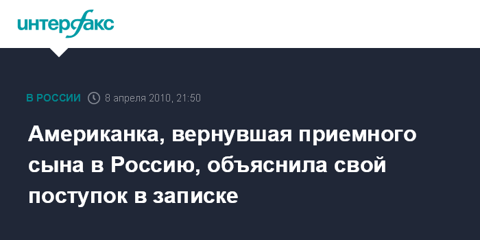 В ней, по словам Астахова, приемная мать ребенка Тори Хансен написала: "Тем, кого это может касаться: я сделала ошибку, я была введена в заблуждение. Чтобы не разрушать свою жизнь, жизнь моих друзей, моих близких, я возвращаю ребенка и отказываюсь от усыновления".