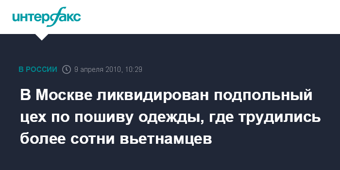 осква. 9 апреля. INTERFAX.RU – Столичное управление Федеральной миграционной службы при поддержке сотрудников уголовного розыска и московского ОМОНа обнаружили незаконную швейную фабрику на территории завода "Красный богатырь", сообщили "Интерфаксу" в пресс-службе УФМС по Москве в пятницу.