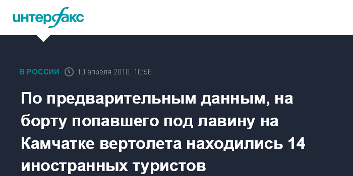 Москва. 9 апреля. INTERFAX.RU - На борту вертолета, который попал под лавину на Камчатке, находились 18 человек, 14 из них - иностранные туристы, сообщили агентству "Интерфакс-Дальний Восток" в Управлении МЧС по Камчатскому краю.
