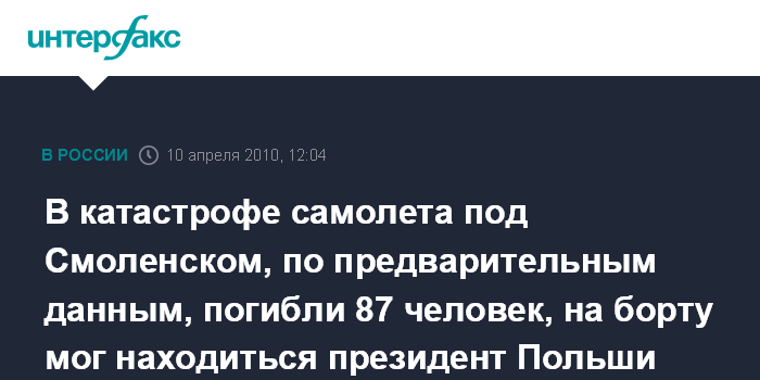 Москва. 10 апреля. INTERFAX.RU - Под Смоленском потерпел крушение самолет, на борту которого мог находиться президент Польши Лех Качиньский. "По предварительным данным, погибли 87 человек. О судьбе самого Леха Качиньского пока не сообщается", - сообщил в субботу телеканал "Россия 24" со ссылкой на МЧС РФ.