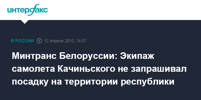 Москва. 10 апреля. INTERFAX.RU - Экипаж самолета президента Польши не запрашивал посадку на территории Белоруссии, заявил агентству "Интерфакс-Запад" директор департамента по авиации министерства транспорта и коммуникаций Белоруссии Вадим Мельник.