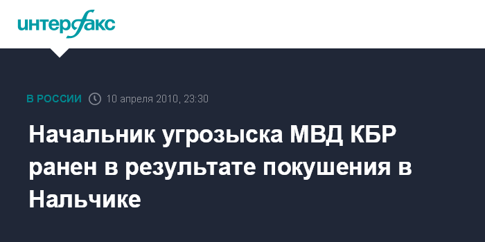 Нальчик. 10 апреля. ИНТЕРФАКС-ЮГ - В Нальчике совершено покушение на начальника Управления уголовного розыска МВД по Кабардино-Балкарии полковника Зубера Шукаева.