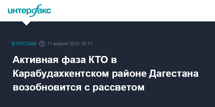 Махачкала. 11 апреля. ИНТЕРФАКС-ЮГ - Активная фаза контртеррористической операции в Карабудахкентском районе Дагестана приостановлена с наступлением темноты, сообщили "Интерфаксу" в пресс- службе УФСБ России и по Дагестану в воскресенье вечером.