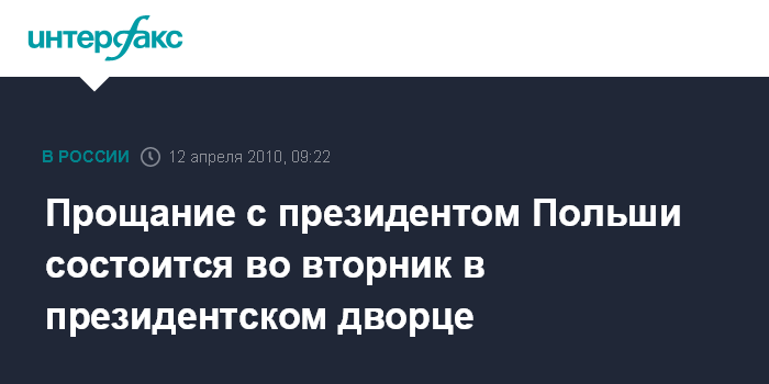 Москва. 12 апреля. INTERFAX.RU - Гроб с телом президента Польши Леха Качиньского во вторник будет выставлен в президентском дворце для публичного прощания, сообщил министр президентской канцелярии Яцек Сасин.
