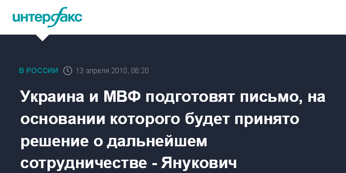Вашингтон. 13 апреля. ИНТЕРФАКС-УКРАИНА - Украина и Международный валютный фонд в течение двух недель подготовят письмо, на основании которого будет принято решение о дальнейшем сотрудничестве, заявил президент Украины Виктор Янукович на пресс-конференции в Вашингтоне в ночь на вторник.