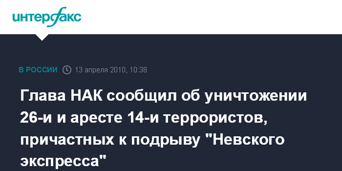 Москва. 13 апреля. INTERFAX.RU - 26 членов террористической группы, организовавших в 2009 году подрыв поезда "Невский экспресс", нейтрализованы, сообщил председатель Национального антитеррористического комитета, директор ФСБ России Александр Бортников.