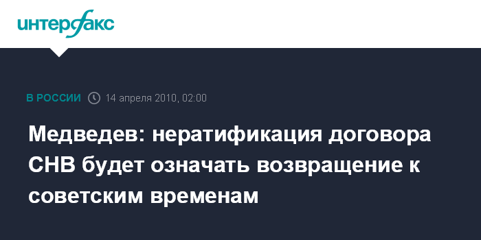 "Что касается START Treaty, мне бы хотелось, чтобы за этим последовал как минимум один юридический факт - ратификация этого договора. Если ратификация состоится, значит мы с президентом Обамой работали не зря. А если ратификации не будет, значит мы вернулись к определенным советским временам, когда такого рода договоры не ратифицировались", - сказал Д.Медведев в Вашингтоне на встрече с американской общественностью.