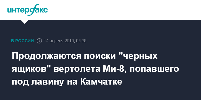 Москва. 14 апреля. INTERFAX.RU - Бортовые средства объективного контроля (черные ящики") вертолета Ми-8, попавшего в лавину на Камчатке 10 апреля, пока не найдены.