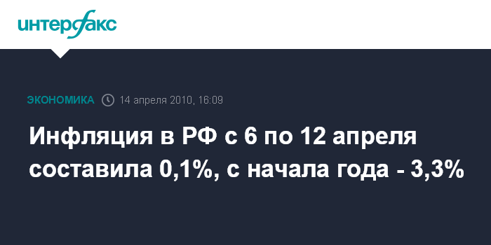 Москва. 14 апреля. INTERFAX.RU - Инфляция в РФ с 6 по 12 апреля составила 0,1%, сообщил Росстат в среду. С начала года рост потребительских цен составил 3,3%, с начала апреля - 0,2%.
