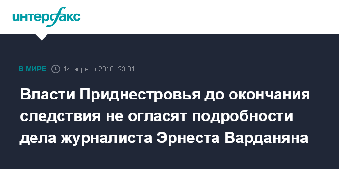 Тирасполь. 14 апреля. ИНТЕРФАКС - До окончания следствия подробности уголовного дела в отношении арестованного 7 апреля в Приднестровье журналиста Эрнеста Варданяна оглашены не будут, расследование будет проведено в рамках закона, заявил в среду президент Приднестровья Игорь Смирнов во время в встречи с послом США в Молдавии.