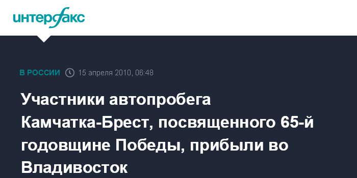 Владивосток. 14 апреля. ИНТЕРФАКС-ДАЛЬНИЙ ВОСТОК - Участники автопробега "Камчатка-Москва-Брест-Москва", посвященного юбилею Великой Победы, прибыли во Владивосток.