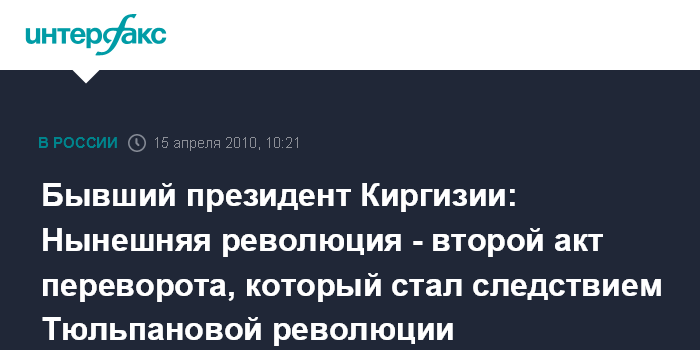 Москва. 15 апреля. INTERFAX.RU - Бывший президент Киргизии Аскар Акаев расценил последние события в стране как "второй акт того самого переворота, который стал следствием Тюльпановой революции", правда, с преобладающим элементом стихийности.