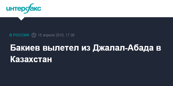 Москва. 15 апреля. INTERFAX.RU - Президент Киргизии Курманбек Бакиев вылетел на самолете из расположенного на юге республики Джалал-Абада в Казахстан, сообщает киргизское агентство АКИpress.