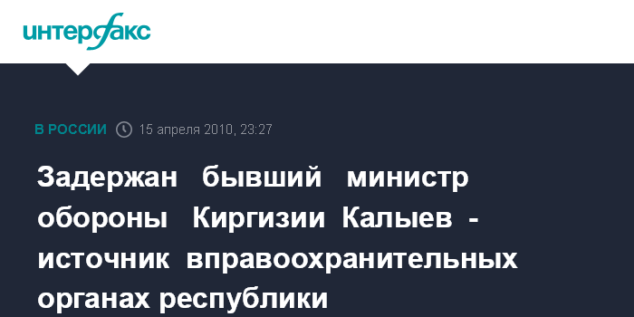 Бишкек. 15 апреля. ИНТЕРФАКС - В ходе спецоперации в Джалал-Абадской области Киргизии задержан бывший министр обороны республики Бакытбек Калыев, сообщил "Интерфаксу" источник в правоохранительных органах Киргизии.
