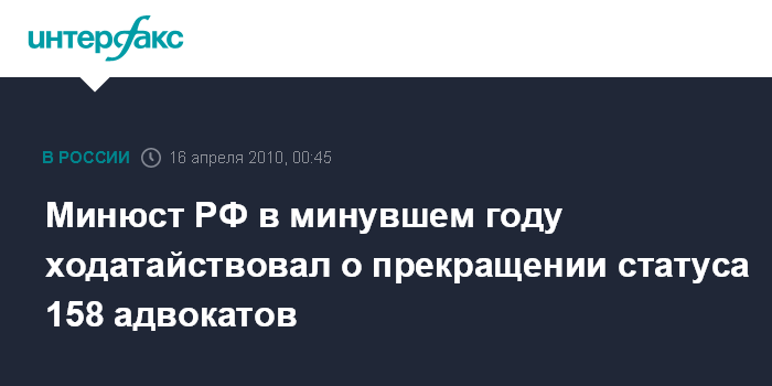 Москва. 16 апреля. ИНТЕРФАКС - Минюст России в 2009 году ходатайствовал о прекращении статуса 158 адвокатов, говорится в публичном докладе по итогам деятельности ведомства в прошлом году.