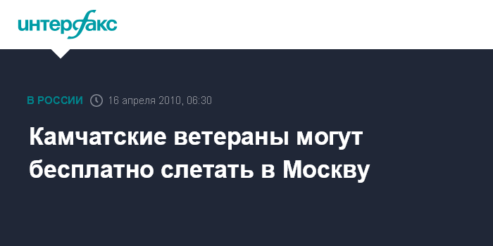 "С 15 апреля ветераны могут получить бесплатные билеты для пролета по маршруту Петропавловск-Камчатский - Москва - Петропавловск-Камчатский самолетами авиакомпаний "Аэрофлот-Российские авиалинии", "Трансаэро" и "Якутия", - сообщили агентству "Интерфакс-Дальний Восток" в агентстве транспорта Камчатского края в пятницу.