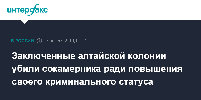 Москва. 16 апреля. INTERFAX.RU - Уголовное дело в отношении двух заключенных колонии общего режима, убивших своего сокамерника, направлено в суд в Алтайском крае. Прокуратура края сообщает, что в мае 2009 года двое заключенных колонии N9 в Рубцовске договорились убить своего сокамерника для того, чтобы, получив новый срок за совершение особо тяжкого преступления, сменить общий режим отбывания наказания на строгий и поднять свой низкий статус в среде осужденных.Дождавшись объявления в колонии отбоя, один из обвиняемых подошел к лежавшему на кровати сокамернику и несколько раз ударил его бритвой по шее. После этого убийцы связали ему руки за спиной и задушили. "Убедившись, что их сокамерник мертв, обвиняемые самостоятельно сообщили об этом сотруднику колонии", - сказано в сообщении.