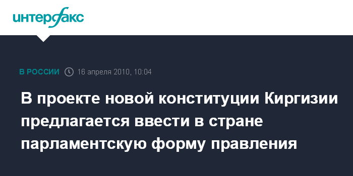 В Киргизии "предлагается ввести парламентскую форму правления", сказал зампред временного правительства страны. Он сообщил, что, согласно проекту, полномочия управления страной перейдут к премьер-министру. "Его кандидатура будет предлагаться партией, набравшей в парламенте большинство голосов, причем если он будет депутатом парламента, то его депутатский статус остается за ним, все другие члены правительства не будут иметь права совмещать свою работу с депутатской деятельностью", - пояснил вице-премьер временного правительства.