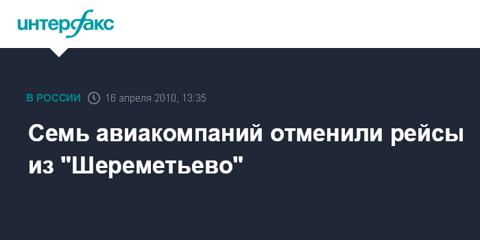 Москва. 16 апреля. INTERFAX.RU - Семь авиакомпаний отменили рейсы из "Международного аэропорта "Шереметьево" из-за шлейфа вулканического пепла в Европе, образовавшегося после извержения вулкана в Исландии, говорится в сообщении аэропорта.