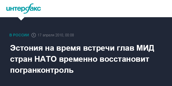 Таллин. 17 апреля. ИНТЕРФАКС - Эстония в связи с проведением неофициальной встречи министров иностранных дел стран-членов НАТО временно восстанавливает пограничный контроль для въезжающих в страну из Евросоюза.