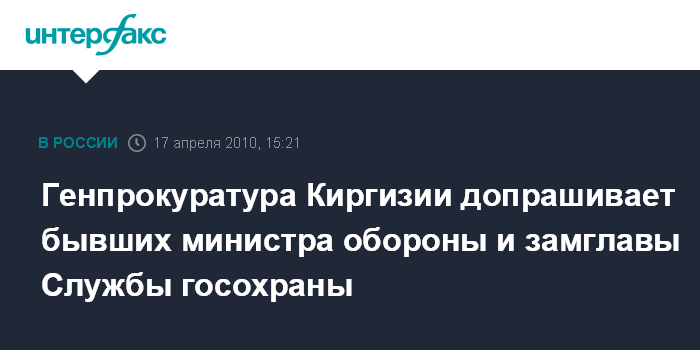 Москва. 17 апреля. INTERFAX.RU - В генеральной прокуратуре Киргизии начался допрос экс-министра обороны Бактыбека Калыева и бывшего заместителя председателя службы государственной охраны страны Данияра Дунганова.