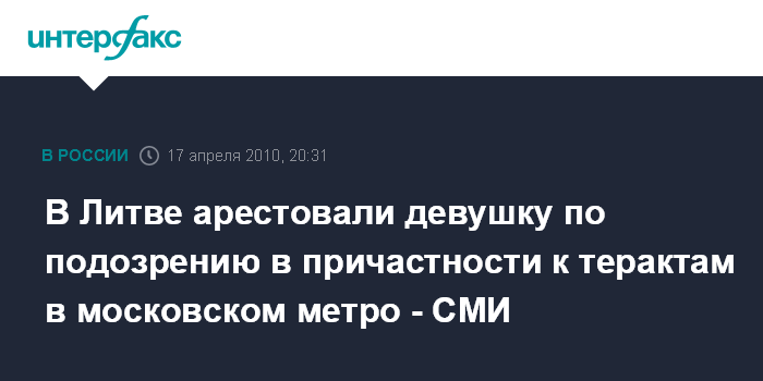 Вильнюс. 17 апреля. ИНТЕРФАКС - Департамент госбезопасности и Генпрокуратура Литвы проверяет информацию о причастности гражданки этой страны к терактам в московском метро 29 марта, сообщил в субботу сайт Delfi.lv.