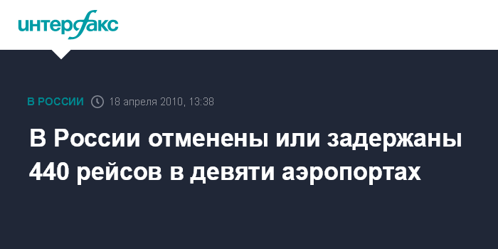 Москва. 18 апреля. INTERFAX.RU - В России из-за извержения вулкана в Исландии авиакомпании уже отменили и задержали 440 рейсов в девяти аэропортах страны, сообщили "Интерфаксу" в Росавиации. Как отметили в Росавиации, в международном аэропорту "Шереметьево" на данный момент было отменено 286 рейсов и 12 задержано. Количество пассажиров, которые должны были улететь на этих рейсах, пока уточняется.