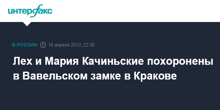 Лондон. 18 апреля. ИНТЕРФАКС - Президент Польши Лех Качиньский и его супруга Мария, погибшие в авиакатастрофе под Смоленском, похоронены в Вавельском замке Кракова, сообщает британская телерадиокорпорация Би- Би-Си в воскресенье.