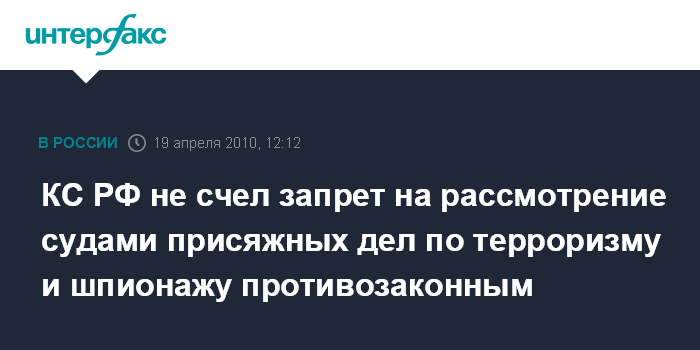 Москва. 19 апреля. INTERFAX.RU - Запрет на рассмотрение судами присяжных уголовных дел по ряду статей, в том числе терроризму и шпионажу, не противоречит Конституции РФ и не нарушает право граждан на судебную защиту, постановил Конституционный суд. Исключение из подсудности присяжных уголовных дел по ряду статей не противоречит Конституции РФ, говорится в решении КС.