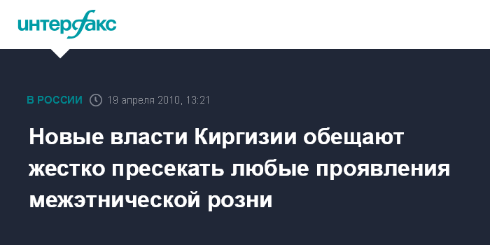 Бишкек. 19 апреля. INTERFAX.RU - Беспорядки в Киргизии не носят какой-либо антироссийской направленности, но временное правительство будет жестко пресекать любые проявления межэтнической розни.