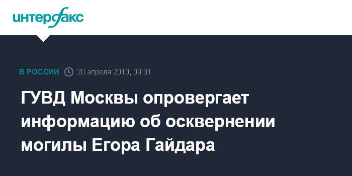 Москва. 20 апреля. INTERFAX.RU - ГУВД Москвы сообщает о завершении проверки, проведенной в связи с сообщениями СМИ об осквернении могилы Егора Гайдара на Новодевичьем кладбище.