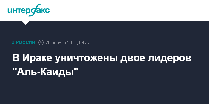 Москва. 20 апреля. INTERFAX.RU - Премьер-министр Ирака и представители администрации США в понедельник заявили об уничтожении двух лидеров иракской сети международной террористической организации "Аль-Каида" в ходе совместной иракско-американской операции.