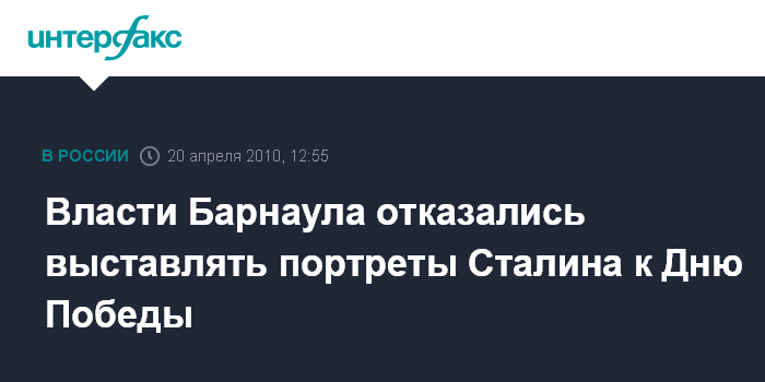 Москва. 20 апреля. INTERFAX.RU - Портреты Иосифа Сталина не будут украшать улицы Барнаула в День Победы. Вице-мэр Барнаула БорисЧерниченко во вторник передал алтайским коммунистам и ветеранам отказ мэрии на их просьбу разместить на улицах города портреты Сталина во время празднования юбилея Победы. "Изначально с такой инициативой выступали ветераны Алтайского края. Член фракции КПРФ в Госдуме РФ Алексей Багаряков поддержал эту идею и предложил городским властям ее реализовать", - сообщил агентству "Интерфакс-Сибирь" пресс-секретарь Багарякова Константин Ганов.