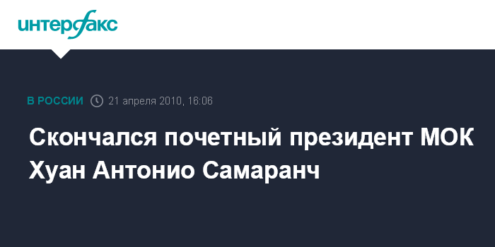 Москва. 21 апреля. INTERFAX.RU – Почетный президент Международного олимпийского комитета (МОК) Хуан Антонио Самаранч скончался в среду в барселонской больнице "Кирон" в возрасте 89 лет, сообщил агентству ЭФЭ главный врач отделения клинической медицины этой больницы Рафаэль Эстебан Мур.