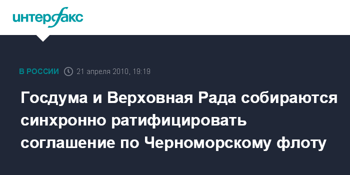 Москва. 21 апреля. INTERFAX.RU - Госдума и Верховная Рада Украины могут в ближайший вторник синхронно ратифицировать подписанное президентами РФ и Украины соглашение о Черноморском флоте, заявил спикер Госдумы Борис Грызлов.